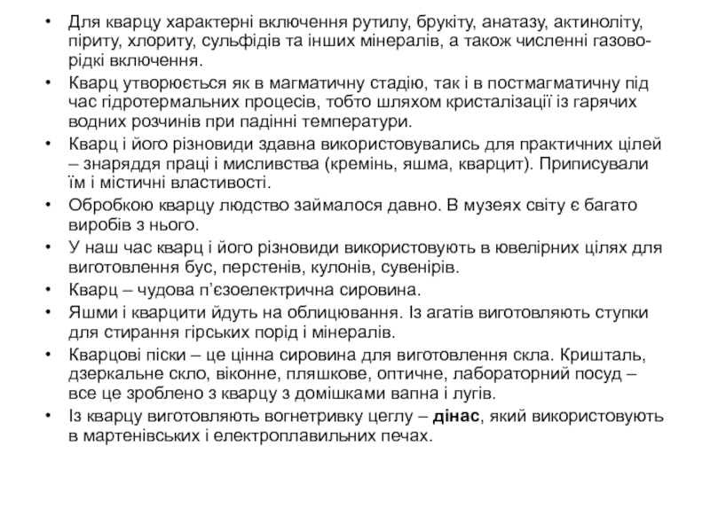 Слайд 3Для кварцу характерні включення рутилу, брукіту, анатазу, актиноліту, піриту, хлориту,