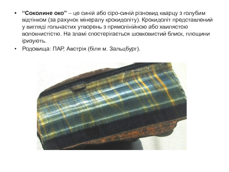 Слайд 60“Соколине око” – це синій або сіро-синій різновид кварцу з