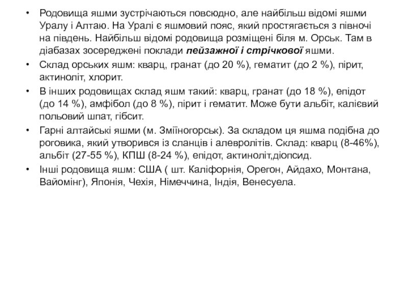Слайд 89Родовища яшми зустрічаються повсюдно, але найбільш відомі яшми Уралу і