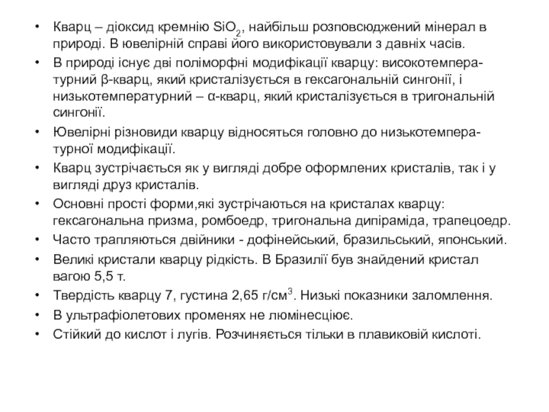 Слайд 2Кварц – діоксид кремнію SiO2, найбільш розповсюджений мінерал в природі.