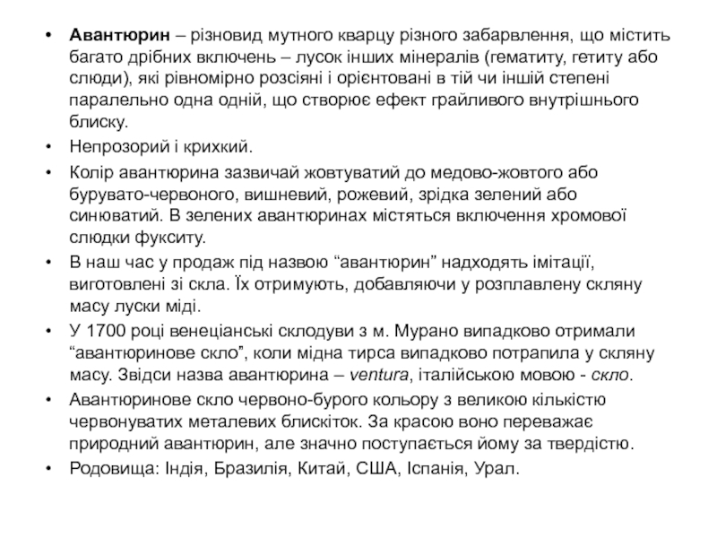 Слайд 52Авантюрин – різновид мутного кварцу різного забарвлення, що містить багато