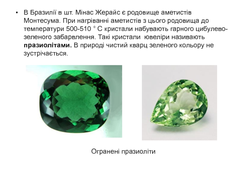 С кристали набувають гарного цибулево-зеленого забарвлення. Такі кристали ювеліри називають празиолітами. В природі чистий кварц зеленого кольору не зустрічається.