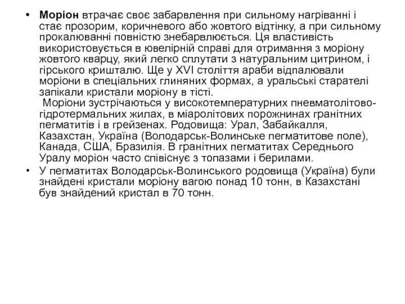 Слайд 18Моріон втрачає своє забарвлення при сильному нагріванні і стає прозорим,