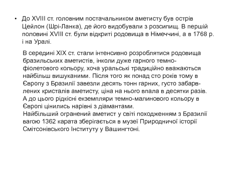 До XVIII ст. головним постачальником аметисту був острів Цейлон (Шрі-Ланка),
