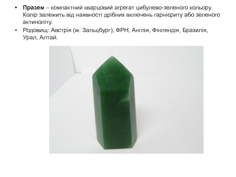 Слайд 71Празем – компактний кварцовий агрегат цибулево-зеленого кольору. Колір залежить від
