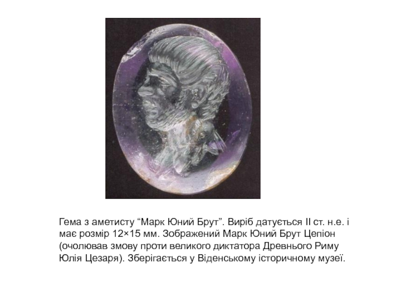 Слайд 37Гема з аметисту “Марк Юний Брут”. Виріб датується II ст.