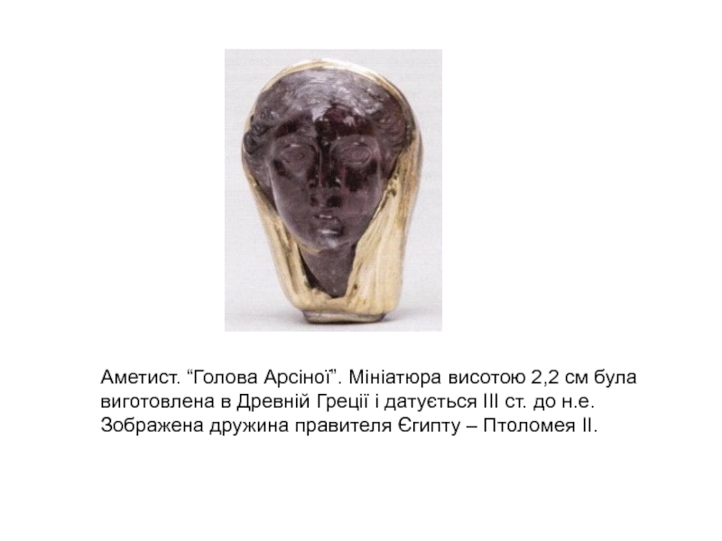 Слайд 35Аметист. “Голова Арсіної”. Мініатюра висотою 2,2 см була виготовлена в