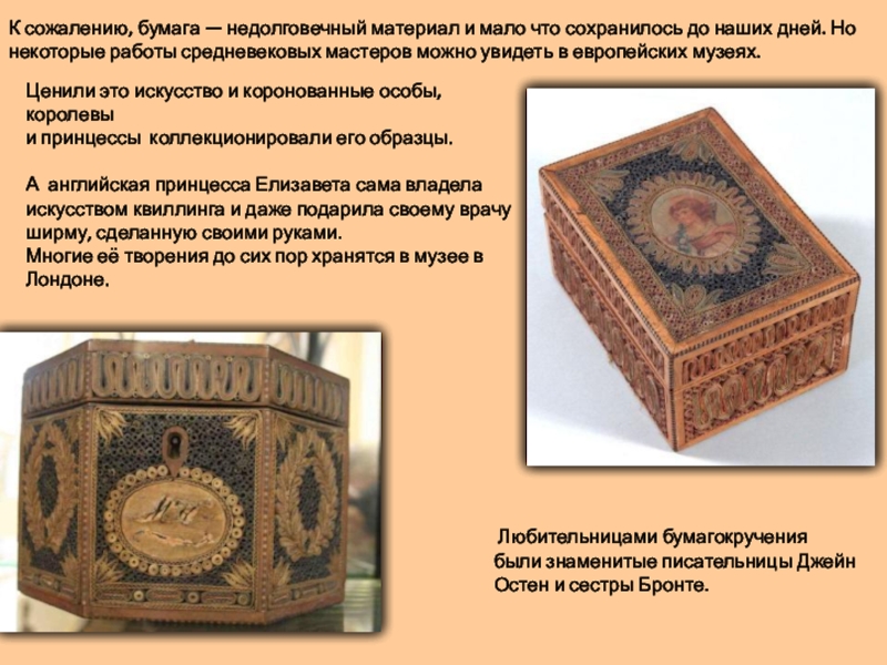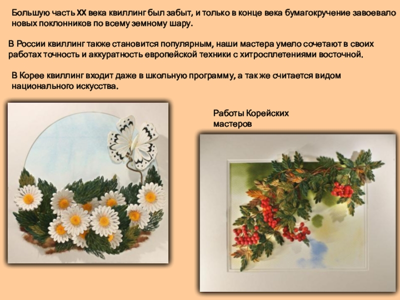 в кругляшки, то есть роллы, длинных и узких полосок бумаги.История квиллинга довольно необычна. Это искусство переходило от запада к востоку и обратно, обогащаясь национальными особенностями разных культур . В древние времена этот вид искусства был известен на Востоке – В Китае, Египте. Из прародителя современной бумаги - папируса ( см. презентацию «Наш друг бумага») стали изготавливать различные украшения.