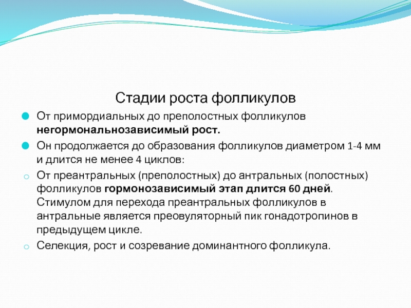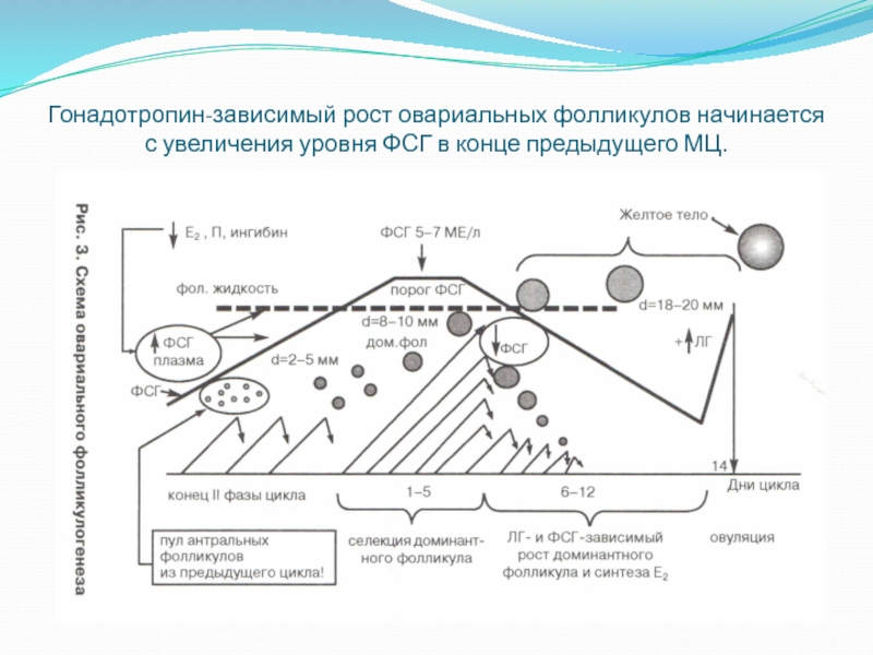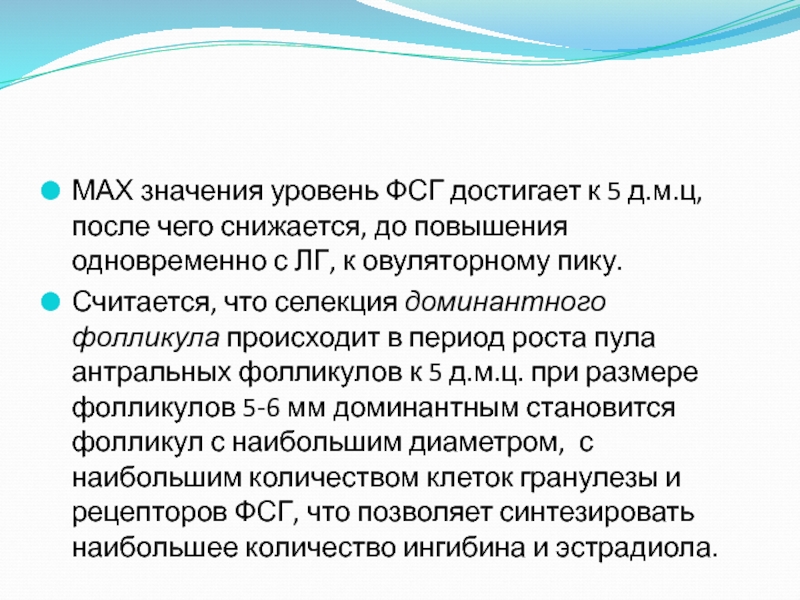селекция доминантного фолликула происходит в период роста пула антральных фолликулов к 5 д.м.ц. при размере фолликулов 5-6 мм доминантным становится фолликул с наибольшим диаметром, с наибольшим количеством клеток гранулезы и рецепторов ФСГ, что позволяет синтезировать наибольшее количество ингибина и эстрадиола.