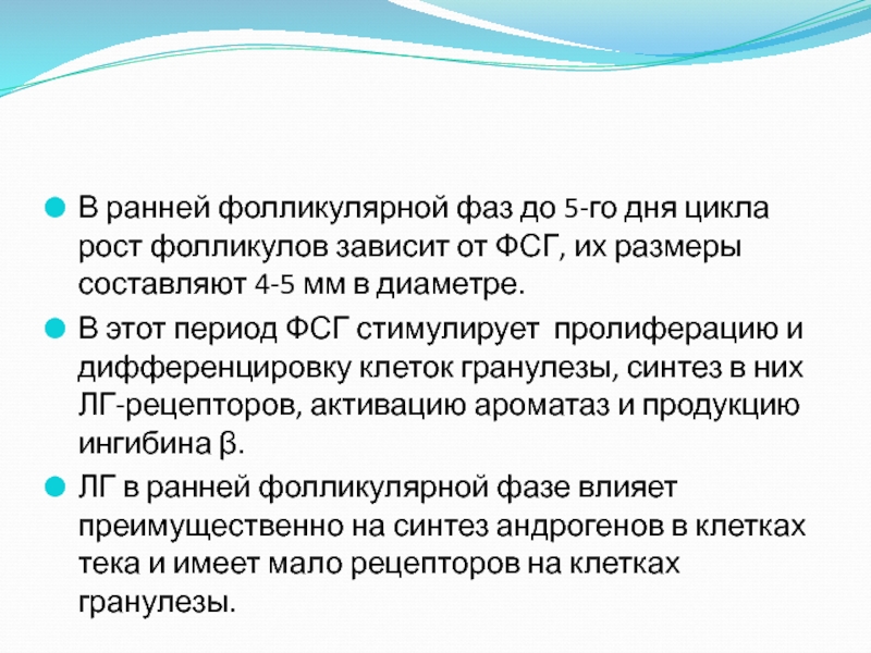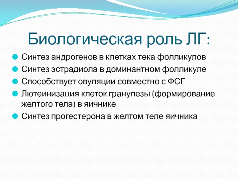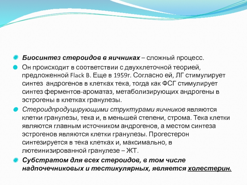 ей, ЛГ стимулирует синтез андрогенов в клетках тека, тогда как ФСГ стимулирует синтез ферментов-ароматаз, метаболизирующих андрогены в эстрогены в клетках гранулезы.