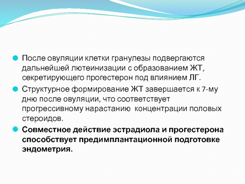 Слайд 39После овуляции клетки гранулезы подвергаются дальнейшей лютеинизации с образованием ЖТ,