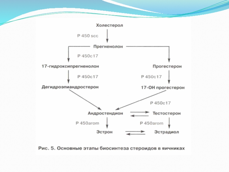 Слайд 43Первые этапы синтеза овариальных стероидов детерминированы гонадтропинами.