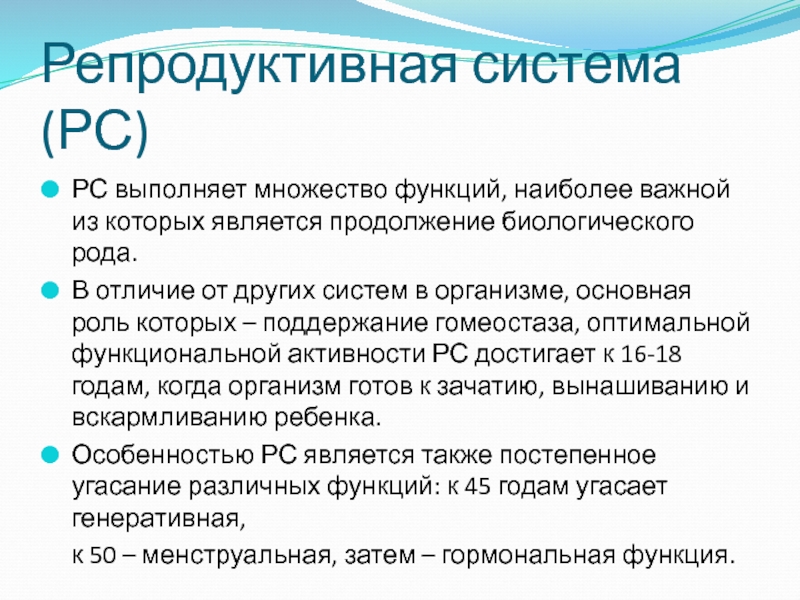 основная роль которых – поддержание гомеостаза, оптимальной функциональной активности РС достигает к 16-18 годам, когда организм готов к зачатию, вынашиванию и вскармливанию ребенка.