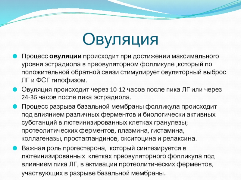Важная роль прогестерона, который синтезируется в лютеинизированных клетках преовуляторного фолликула под влиянием пика ЛГ, в активации протеолитических ферментов, участвующих в разрыве базальной мембраны.