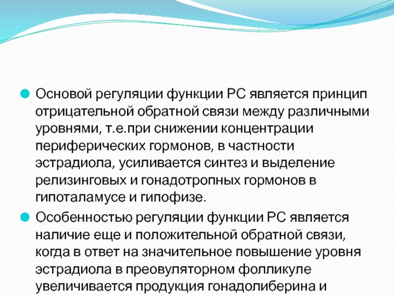 Слайд 3Основой регуляции функции РС является принцип отрицательной обратной связи между