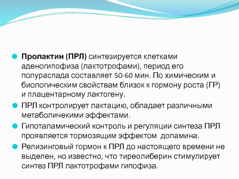 Слайд 15Пролактин (ПРЛ) синтезируется клетками аденогипофиза (лактотрофами), период его полураспада составляет