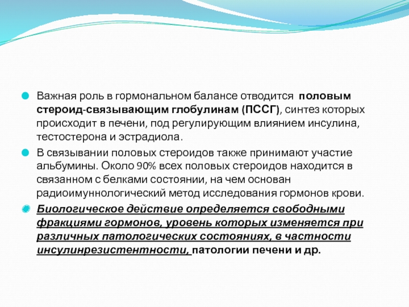 Слайд 47Важная роль в гормональном балансе отводится половым стероид-связывающим глобулинам (ПССГ),