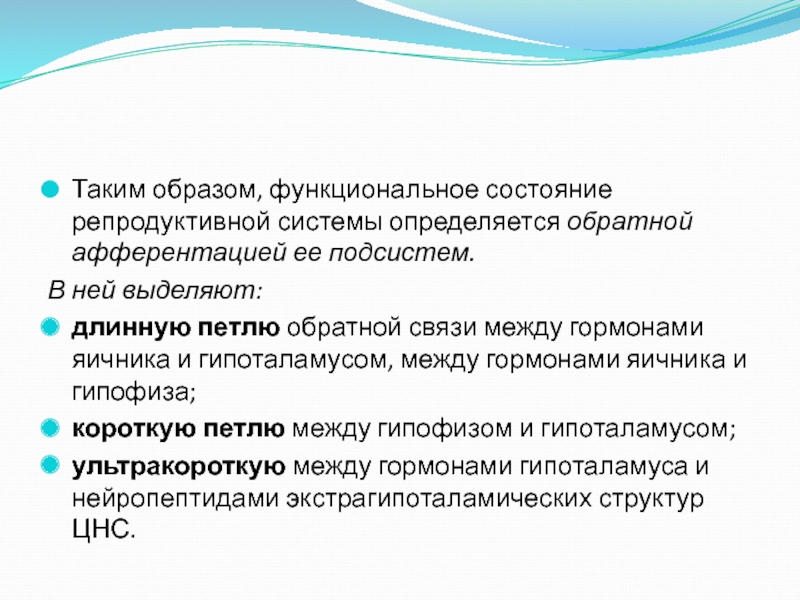 Слайд 54Таким образом, функциональное состояние репродуктивной системы определяется обратной афферентацией ее