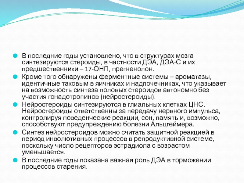 Синтез нейростероидов можно считать защитной реакцией в период инволютивных процессов в репродуктивной системе, поскольку число рецепторов эстрадиола с возрастом уменьшается.