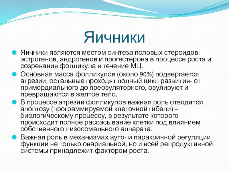 В процессе атрезии фолликулов важная роль отводится апоптозу (программируемой клеточной гибели) – биологическому процессу, в результате которого происходит полное рассасывание клетки под влиянием собственного лизосомального аппарата.