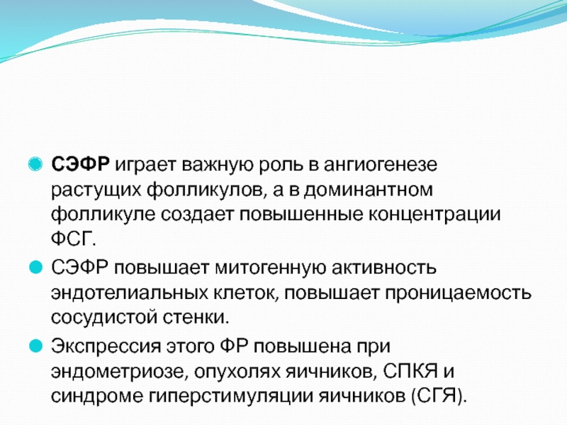 Важная роль в росте доминантного фолликула отводится СЭФР, который способствует неоангиогенезу.