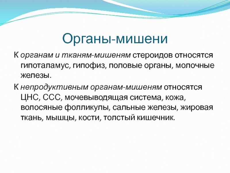 К органам и тканям-мишеням стероидов относятся гипоталамус, гипофиз, половые органы,