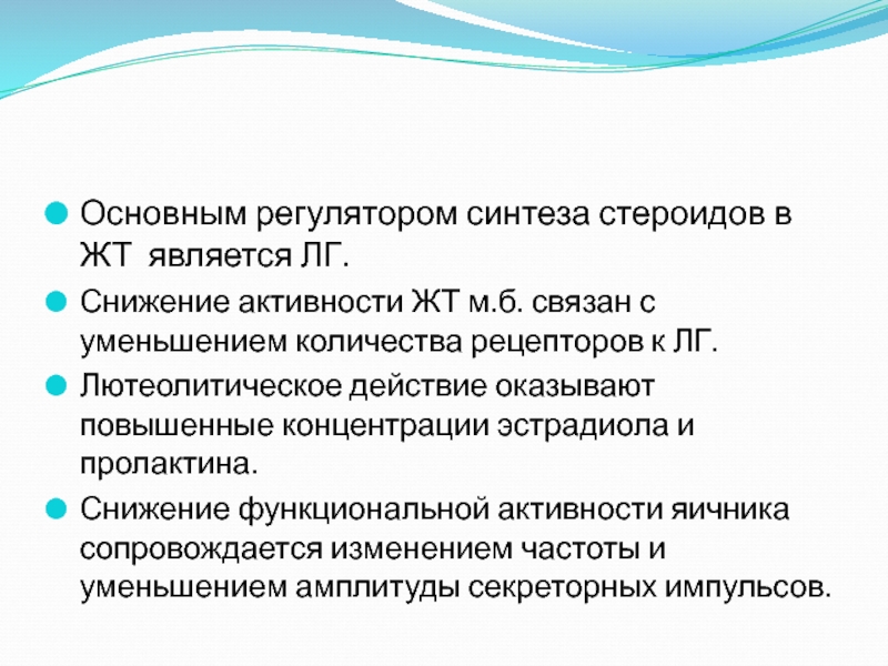 Слайд 40Основным регулятором синтеза стероидов в ЖТ является ЛГ.