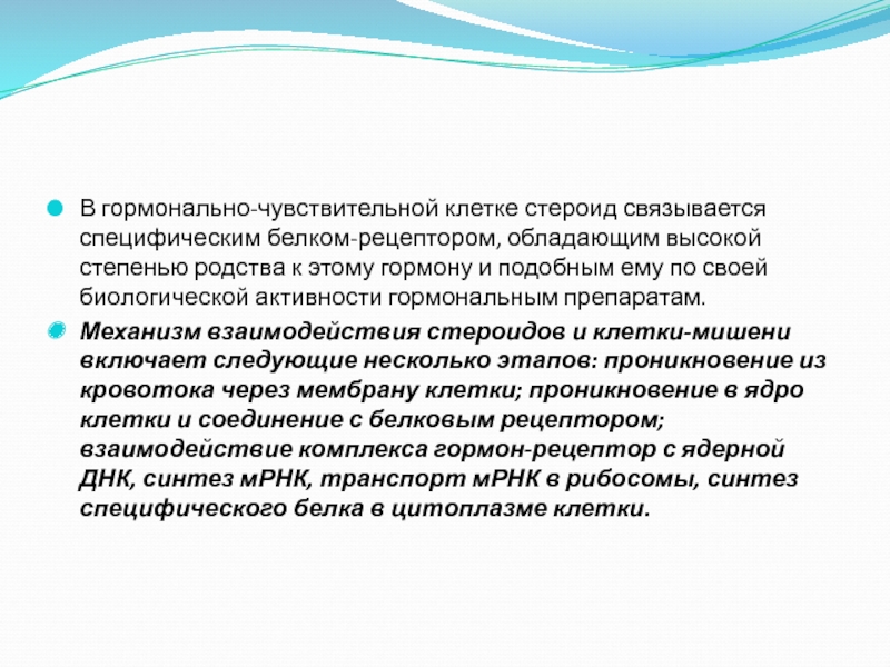 Слайд 53В гормонально-чувствительной клетке стероид связывается специфическим белком-рецептором, обладающим высокой степенью