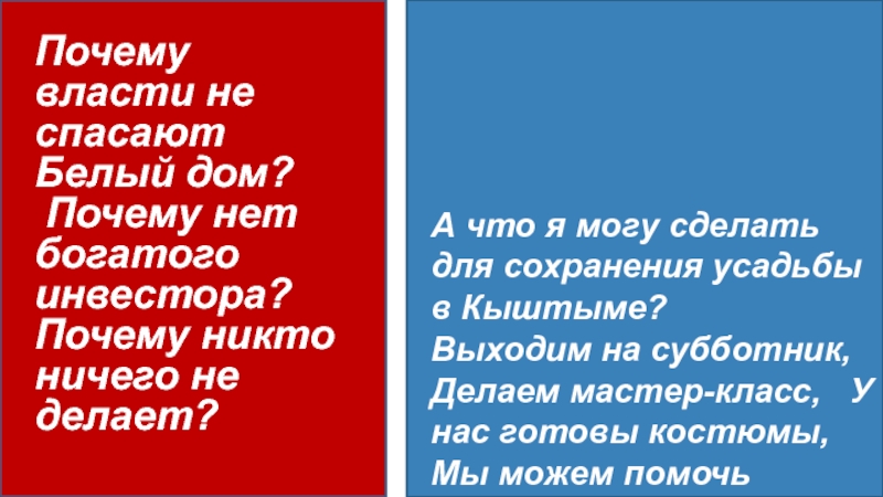 Почему власти не спасают Белый дом? Почему нет богатого инвестора?Почему никто ничего не делает?А что я могу