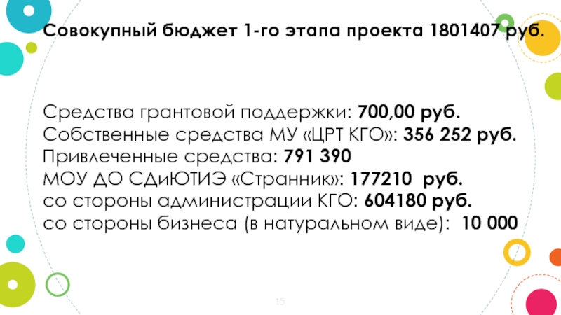 Слайд 16Совокупный бюджет 1-го этапа проекта 1801407 руб.