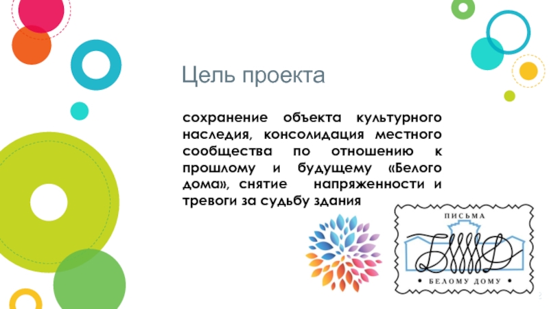 Цель проектасохранение объекта культурного наследия, консолидация местного сообщества по отношению к прошлому и будущему «Белого дома», снятие напряженности и тревоги за судьбу здания