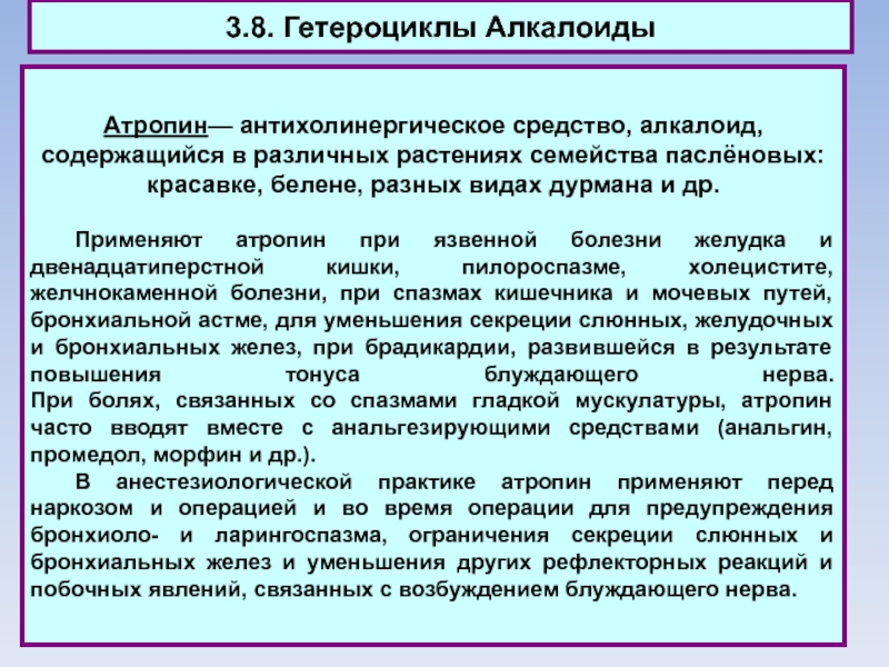 Атропин— антихолинергическое средство, алкалоид, содержащийся в различных растениях