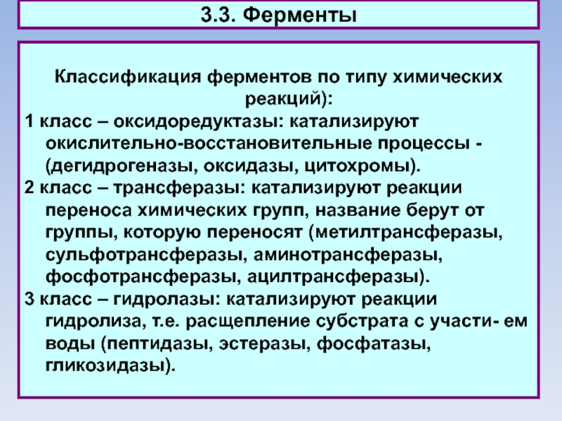 3 класс – гидролазы: катализируют реакции гидролиза, т.е. расщепление субстрата с участи- ем воды (пептидазы, эстеразы, фосфатазы, гликозидазы).