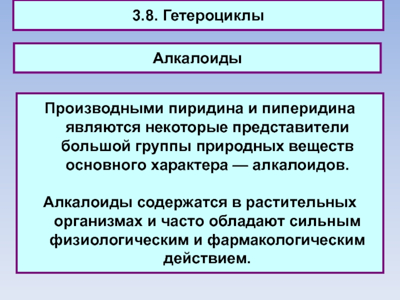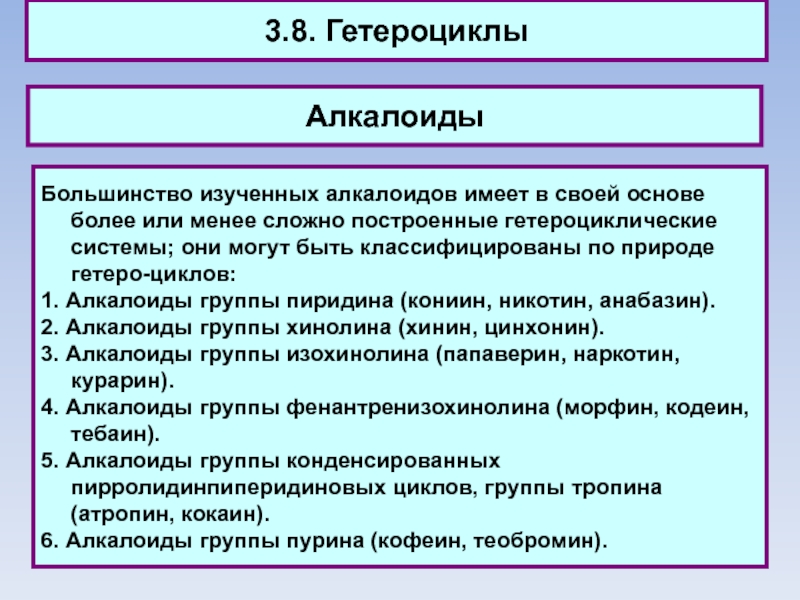 1. Алкалоиды группы пиридина (кониин, никотин, анабазин).
