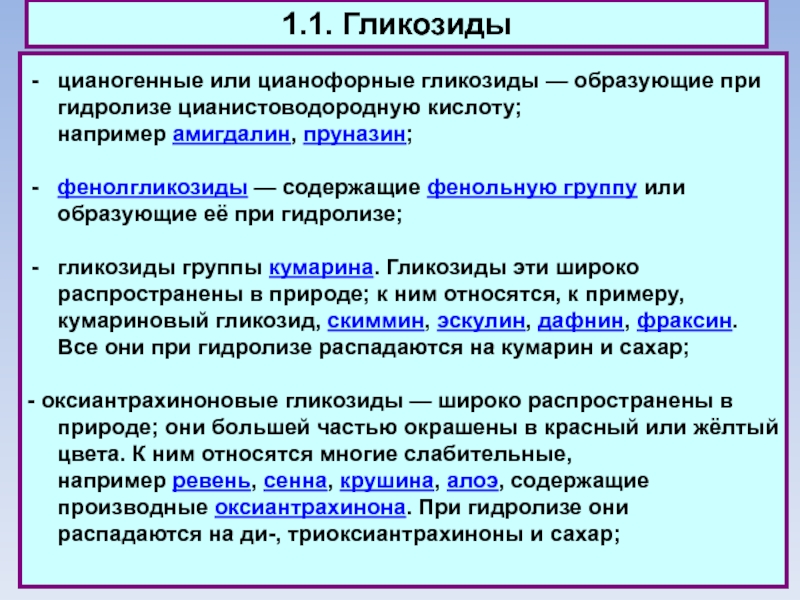 цианогенные или цианофорные гликозиды — образующие при гидролизе цианистоводородную кислоту;