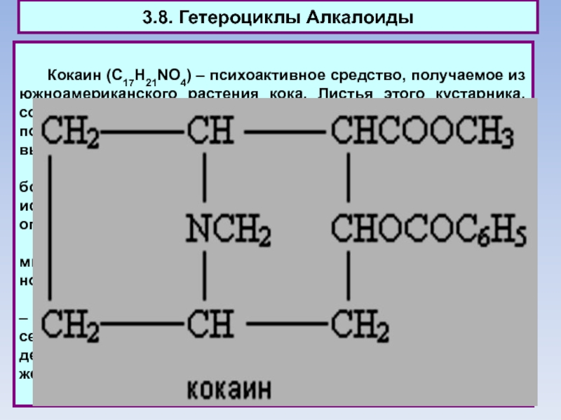 Кокаин (C17H21NO4) – психоактивное средство, получаемое из южноамериканского