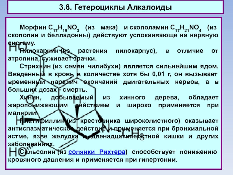 4. Алкалоиды группы фенантренизохинолина (морфин, кодеин, тебаин).
