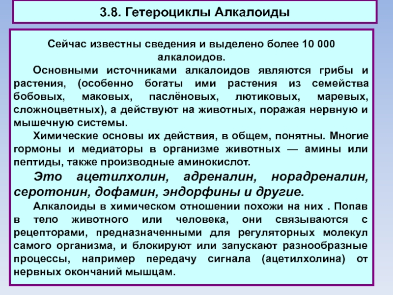 Алкалоиды в химическом отношении похожи на них . Попав в тело животного или человека, они связываются с рецепторами, предназначенными для регуляторных молекул самого организма, и блокируют или запускают разнообразные процессы, например передачу сигнала (ацетилхолина) от нервных окончаний мышцам.
