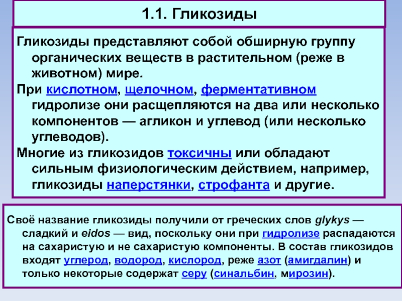 Своё название гликозиды получили от греческих слов glykys — сладкий и eidos — вид, поскольку они при гидролизе распадаются на сахаристую и не сахаристую компоненты. В состав гликозидов входят углерод, водород, кислород, реже азот (амигдалин) и только некоторые содержат серу (синальбин, мирозин).