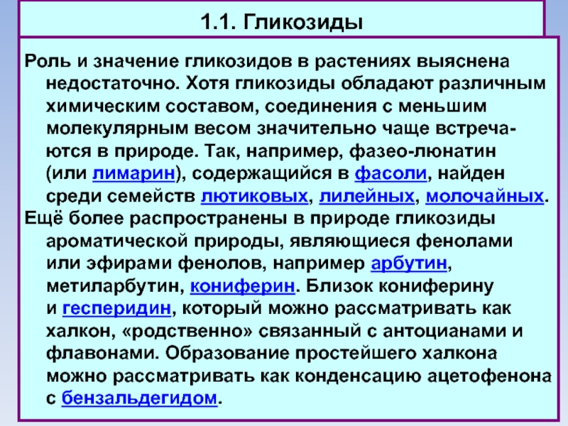 Ещё более распространены в природе гликозиды ароматической природы, являющиеся фенолами или эфирами фенолов, например арбутин, метиларбутин, кониферин. Близок кониферину и гесперидин, который можно рассматривать как халкон, «родственно» связанный с антоцианами и флавонами. Образование простейшего халкона можно рассматривать как конденсацию ацетофенона с бензальдегидом.