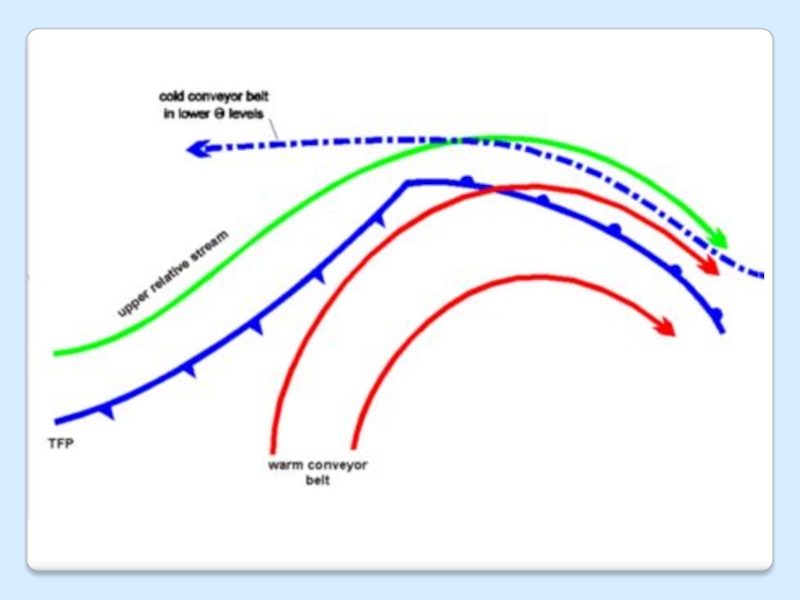 • Жылы алдыңғы группадан айырмашылық бар- бұлттардың құрылымы) Жылы алдыңғы қалқанның жылы секторы- бұлттылықпен жабылған, жылы ленталы конвейер қабатына көтерілген, олар жақсы дамыған ,тропосфераның терең қабатынан өтеді.
