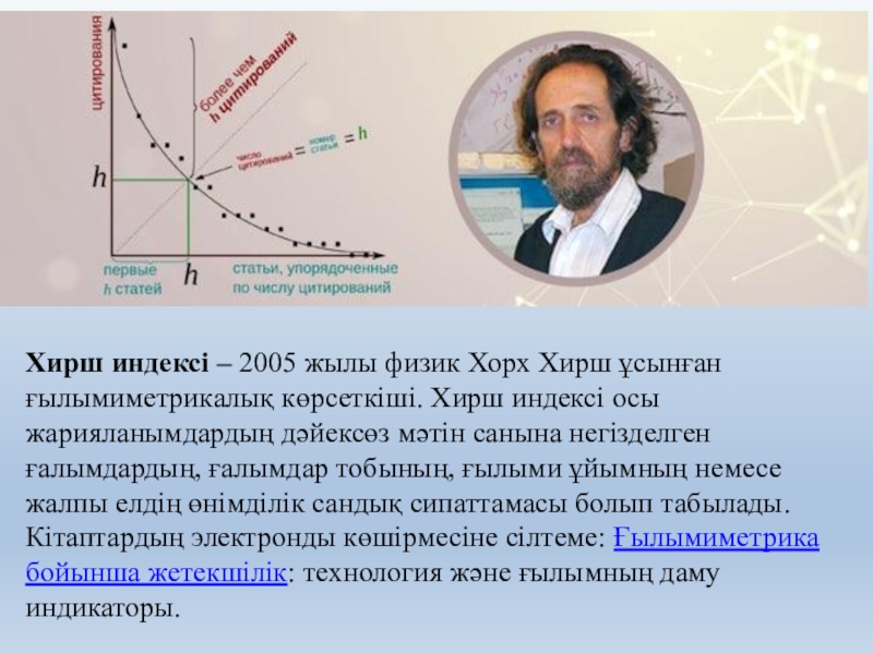 Слайд 8Хирш индексі – 2005 жылы физик Хорх Хирш ұсынған ғылымиметрикалық көрсеткіші.