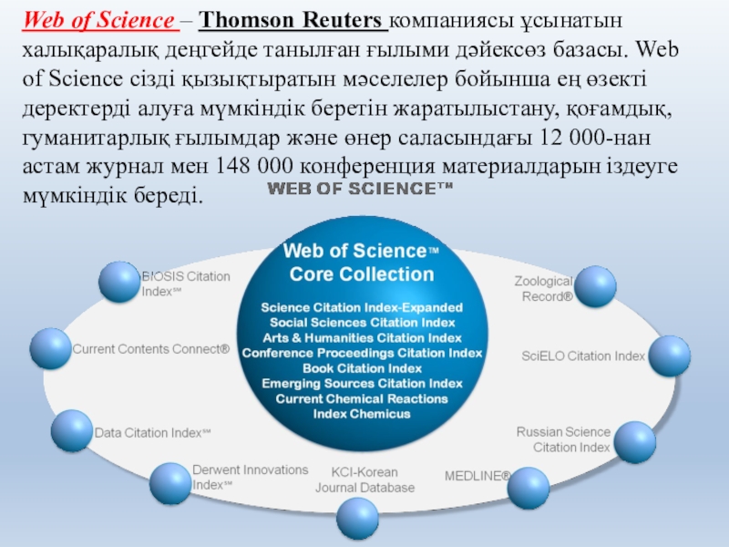 Слайд 17Web of Science – Thomson Reuters компаниясы ұсынатын халықаралық деңгейде