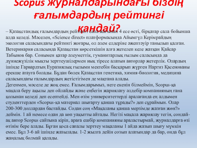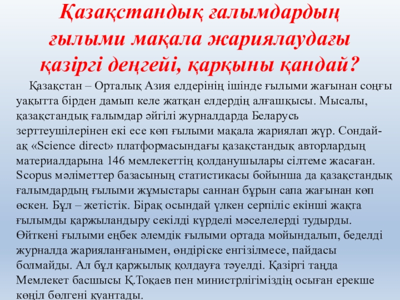 Слайд 27Қазақстандық ғалымдардың ғылыми мақала жариялаудағы қазіргі деңгейі, қарқыны қандай?
