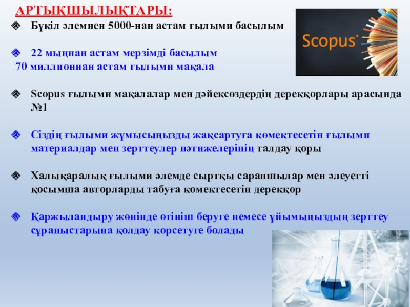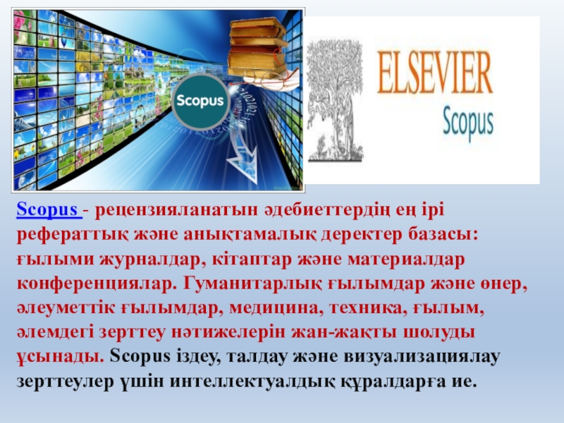 Слайд 9Scopus - рецензияланатын әдебиеттердің ең ірі рефераттық және анықтамалық деректер базасы: