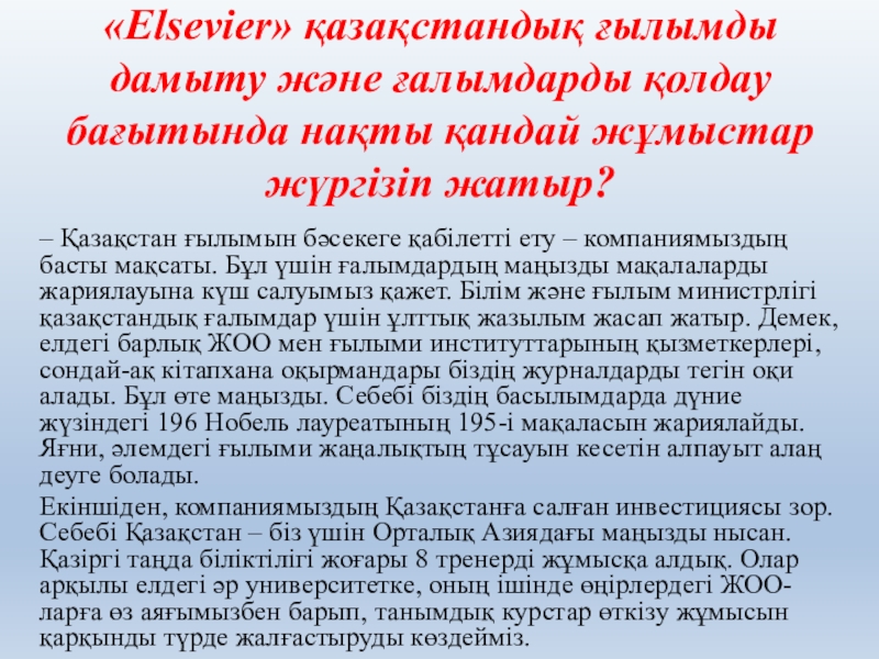 Слайд 28«Elsevier» қазақстандық ғылымды дамыту және ғалымдарды қолдау бағытында нақты қандай