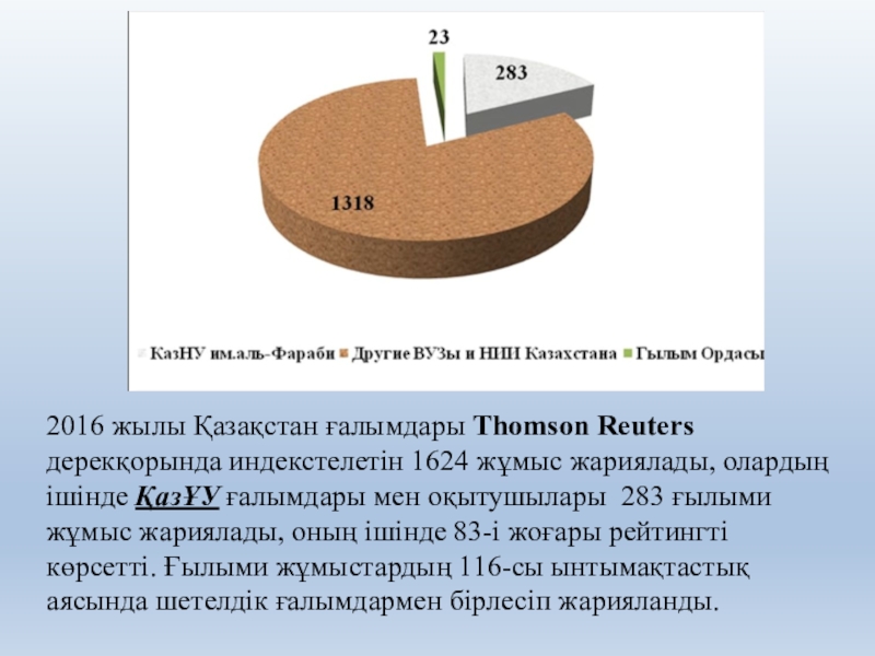 Слайд 192016 жылы Қазақстан ғалымдары Thomson Reuters дерекқорында индекстелетін 1624 жұмыс