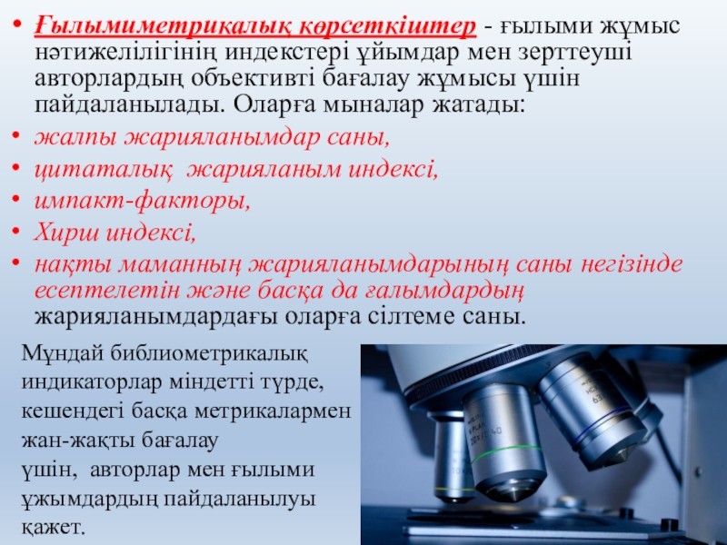 Слайд 5Ғылымиметрикалық көрсеткіштер - ғылыми жұмыс нәтижелілігінің индекстері ұйымдар мен зерттеуші авторлардың