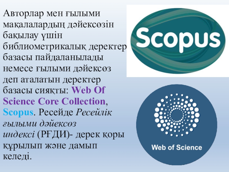 Слайд 6Авторлар мен ғылыми мақалалардың дәйексөзін бақылау үшін библиометрикалық деректер базасы