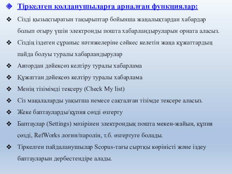 Слайд 13Тіркелген қолданушыларға арналған функциялар: